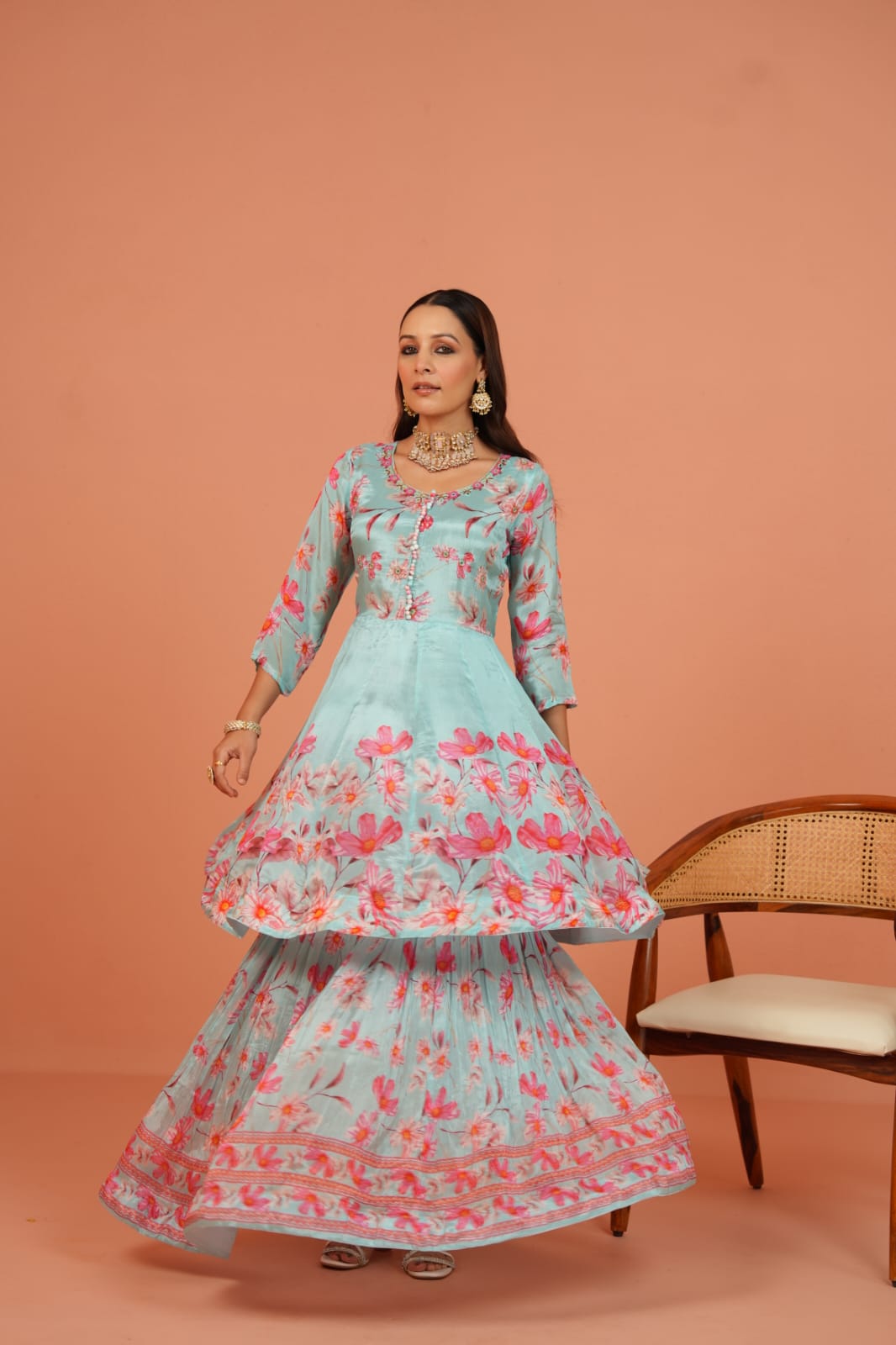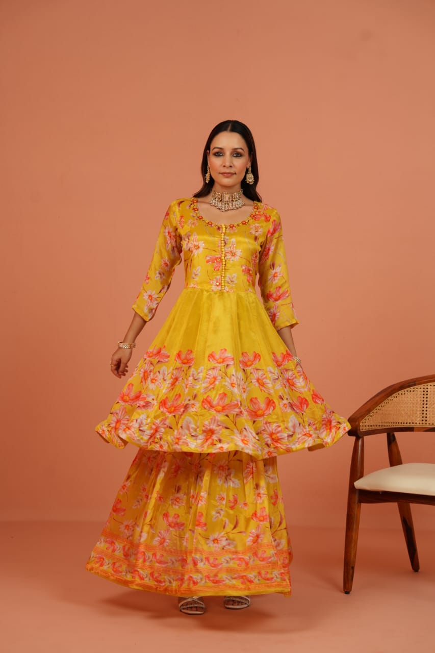 Turn heads with this radiant party wear Anarkali set made from luxurious Chinon fabric. The vibrant floral print brings life to the elegant silhouette, featuring a beautifully flared kurti with a matching full-length skirt. Whether it's a festive celebration or a pre-wedding event, this outfit ensures you shine with grace.