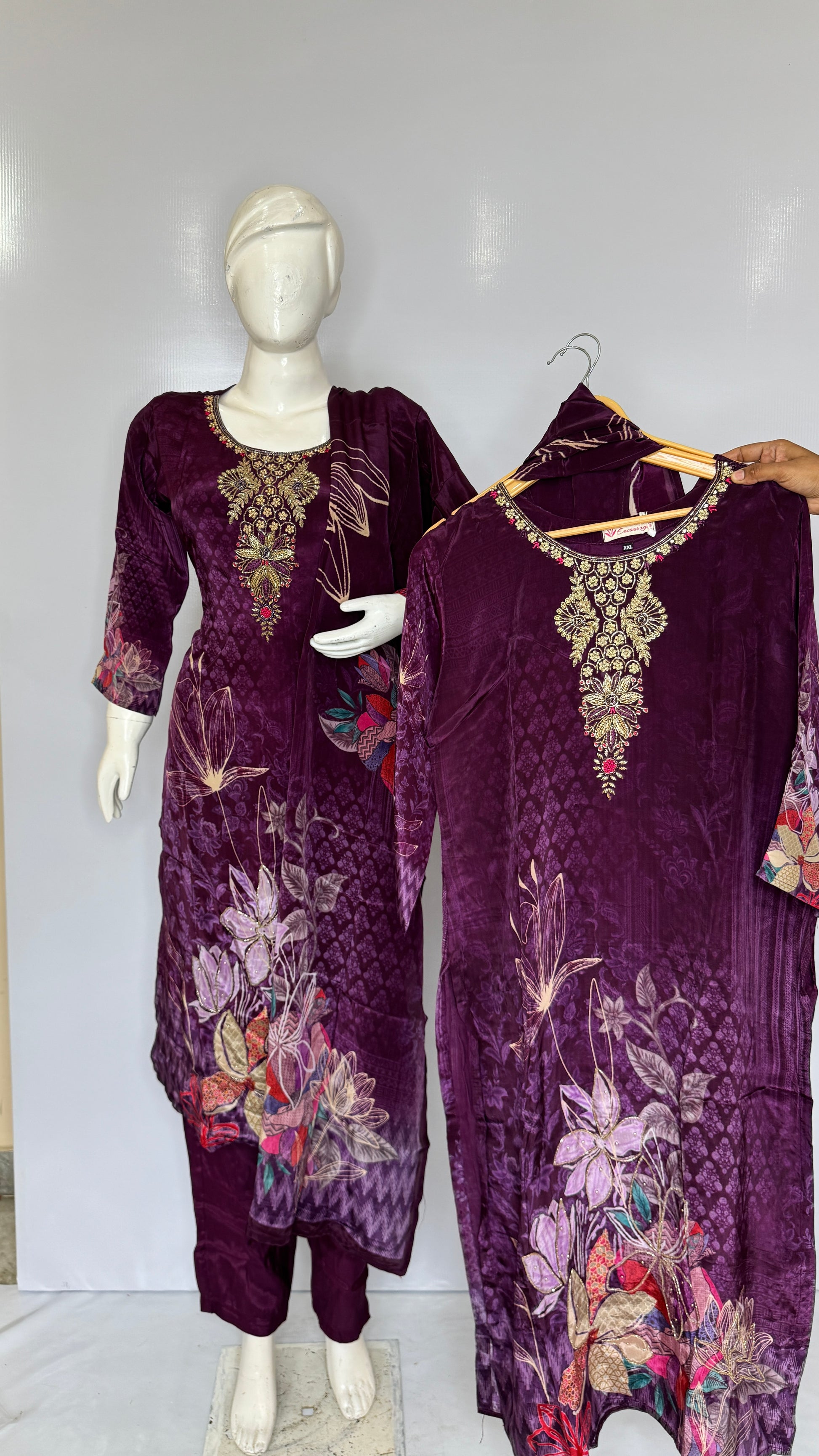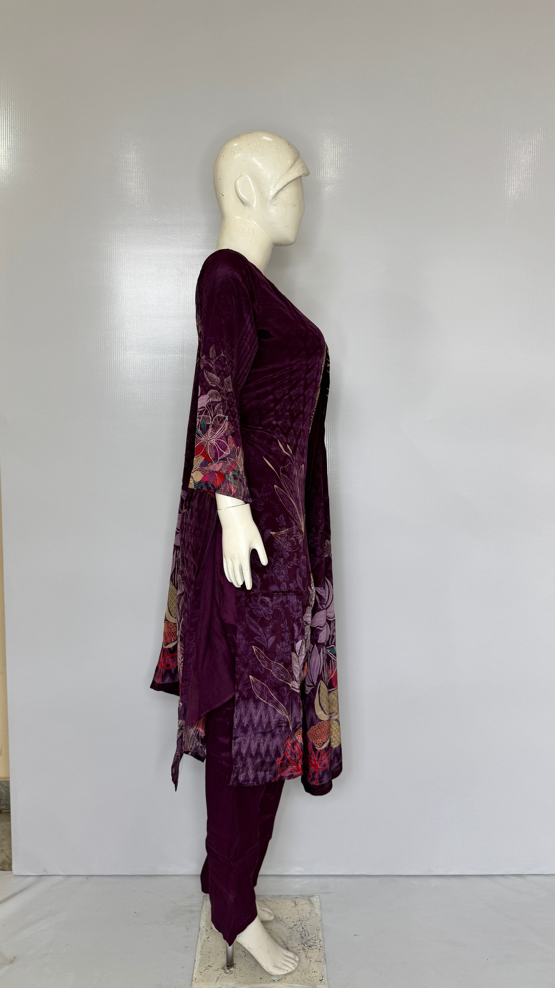 Royal Dark Purple Velvet Touch Suit Set with Heavy Neck Embroidery & Floral Daman