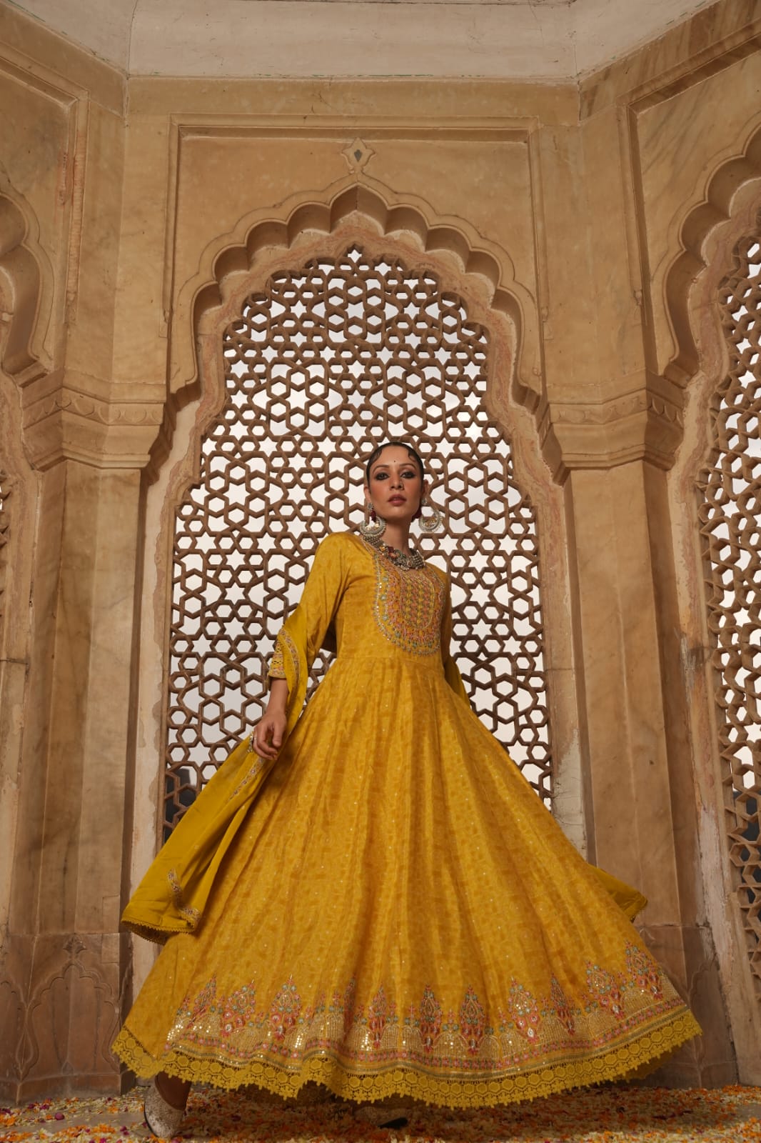 Turn heads with this exquisite yellow-green gown, crafted from luxurious Maslin fabric and adorned with intricate lace work and heavy embroidery. Featuring a vibrant digital print that brings a modern flair, this gown is designed to make you stand out at any party or festive gathering. The lace detailing adds a touch of delicacy, while the embroidery enhances the gownβs opulent appeal. Flattering and elegant, this gown beautifully combines traditional craftsmanship with contemporary style, making it a must-have for special occasions.